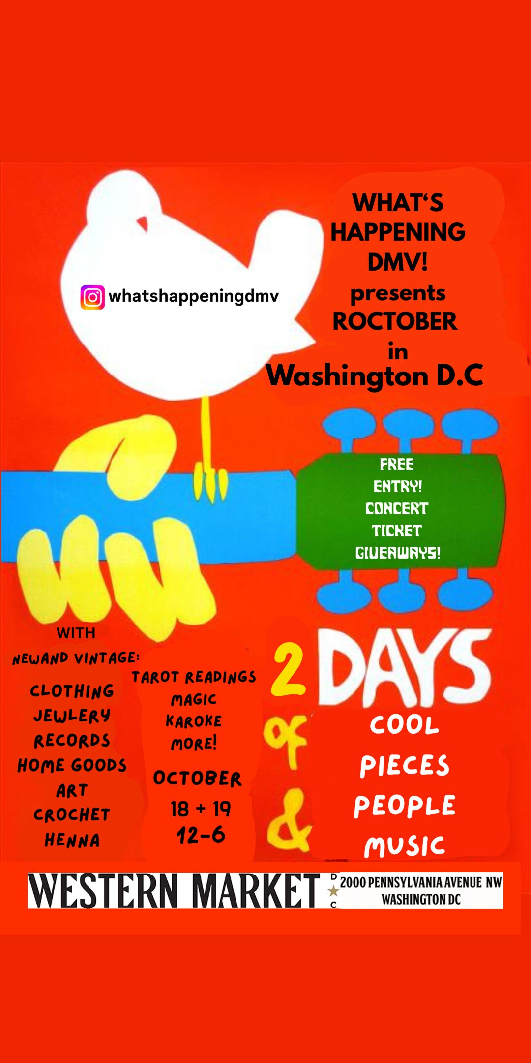 Eat, Shop, Karaoke, and Enjoy at Western Market DC from 12 to 6! Free Entry! Tarot Readings! Henna Tattoos! Magic! T-Shirt Giveaways ! New movie ticket giveaways! Win concert tickets and dance party tickets all weekend long!